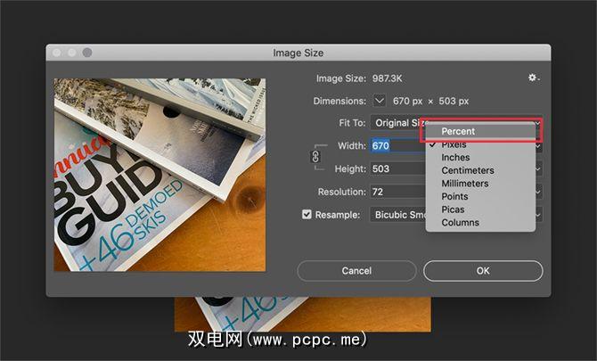 要在Photoshop中将其重采样到10%,请转到 Image> Image大小。然后-选择 Percent (而不是按像素调整宽度和高度)。键入 110%,并确保重新采样:双三次平滑器仍处于打开状态。