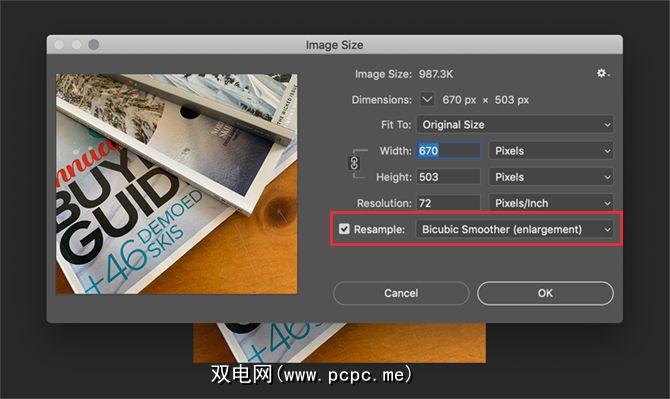 如果要使用此功能方法,确保在照片编辑应用程序中启用重新采样非常重要。这是在Photoshop中的图像大小对话框中的外观: