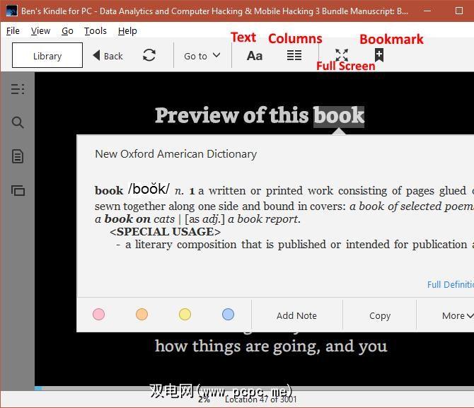 一些额外的功能使Kindle应用程序的技巧更加完善。在左侧栏中,您会找到目录,搜索,笔记本和抽认卡的按钮。 笔记本保存您的书签,您甚至可以创建一些闪存卡,对其进行颜色编码以供以后使用,或在其中添加注释。