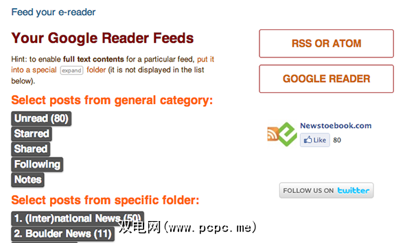 前往NewsToebook,我们将开始。您会看到两个选择-添加任何RSS feed或转换您的Google Reader。