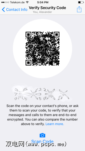 然后,您可以与朋友或家人共享数字或密码。如果您的朋友或家人在附近,那么您很幸运。您可以扫描彼此的代码以确保您的聊天记录已加密。如果距离不远,请通过iPhone,Android或Windows手机上的共享按钮通过短信,电子邮件等方式将60位代码发送给他们。
