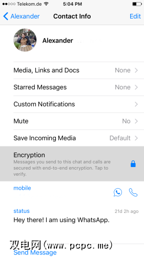 要确保功能已更新,请 o 笔聊天并轻按您的朋友或家人的名字。然后,您将被带到他们的联系信息页面,该页面显示您的邮件是否已加密,如下图的突出显示部分所示。