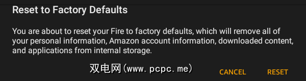 要从Fire OS内硬重置Kindle Fire,转到设置>设备选项>重置为出厂默认值。阅读警告,然后按重置以启动该过程。您的Kindle Fire会立即重新启动并清除所有内容。