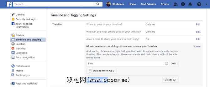 Facebook还提供了一些简单的评论过滤选项。您将必须手动设置要屏蔽的单词列表。与Twitter一样,Facebook将完全在您的时间轴中隐藏匹配的评论,而不仅仅是您的帖子。
