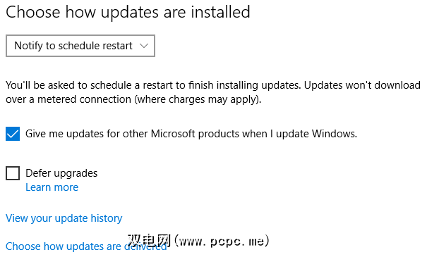 在高级选项下,您可以调整更新的安装方式和查看您的更新历史记录。如果您使用的是Windows 10专业版,则可以在限定时间内推迟与新功能相关的升级;安全更新仍将自动应用。