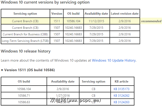 Microsoft TechNet Windows 10版本信息中提供了类似但更详细的概述。该页面按服务选项列出了当前Windows 10版本,以及自Windows 10初始发行以来所有累积(星期二补丁)更新的知识库文章。