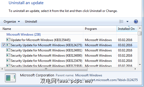 在已安装的更新下,您可以查看计算机上已安装更新的完整历史记录,并按以下顺序对更新进行排序名称,程序,安装日期等。选择一个更新,然后在底部找到相应的知识库文章的链接。