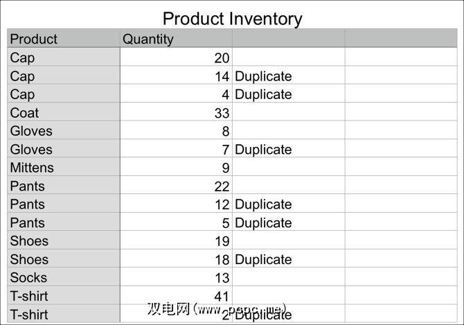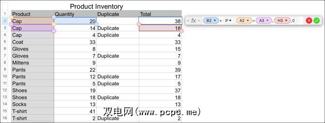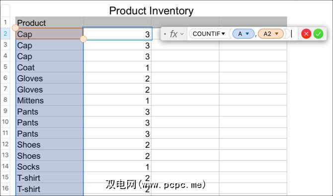 您现在应该在新列中看到数字,该数字显示重复列中的项目出现了多少次。对于上面屏幕截图中的示例,您可以看到Cap出现了3次,Coat出现了一次,Gloves出现了两次。