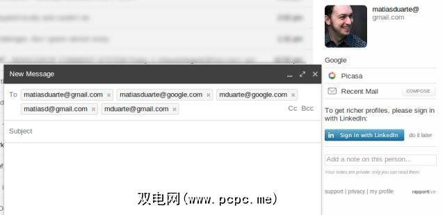 安装Rapportive,将您的社交帐户连接到该帐户,然后打开一个新的撰写窗口。与环聊黑客一样,现在将不同的电子邮件地址排列和组合粘贴到“收件人"字段中。