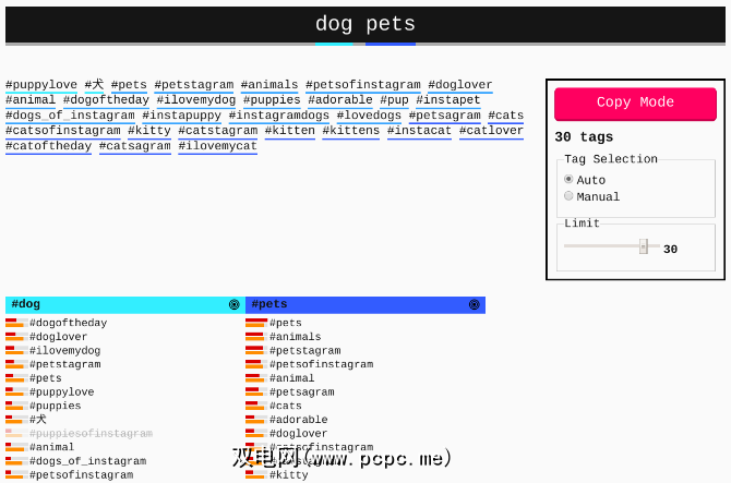 转到“显示目的",然后输入一两个与您上传的照片有关的单词。例如,您可以键入“ dog"和“ pets",然后点击搜索。该网络应用程序将立即列出30个热门主题标签的列表,您可以点击以进行复制。它还巧妙地混合了#号标签,这样您就不会重复使用#号标签,并且更有可能找到越来越受欢迎的#号标签。