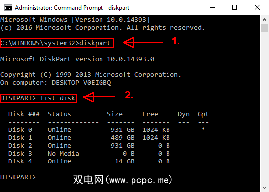 按 Windows键+ X ,然后选择<菜单中的strong>命令提示符(管理员)。键入 diskpart ,然后按Enter(下图中的1.)。接下来,键入列表磁盘,然后按Enter。您应该会看到当前已安装磁盘的列表,如下所示(下图中的2。):