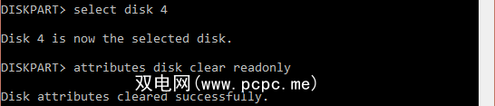 attributes disk clear readonly您已经清除了USB驱动器中所有剩余的只读文件属性。
