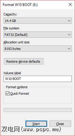 关闭“属性"窗口。现在,再次右键单击USB驱动器,这次选择 Format 。格式窗口包含几个可自定义的选项,例如上述文件系统,分配单位大小,卷标签和快速格式化选项。