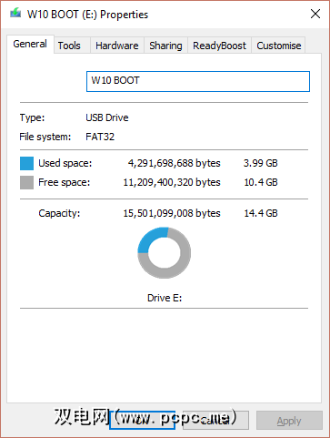 打开Windows资源管理器,然后浏览到我的电脑。这使您可以概览连接到系统的所有驱动器。右键单击您的USB驱动器,然后选择属性。您将看到一个令人愉悦的甜甜圈图(Microsoft,古老的饼图错在哪里?),显示您当前的驱动器容量。