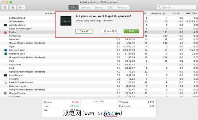 活动监视器打开后,点击顶部的 CPU 标签。您会看到一个运行过程的列表及其详细信息。选择有问题的应用,然后单击左上方的停止( X )按钮,然后选择强制退出。