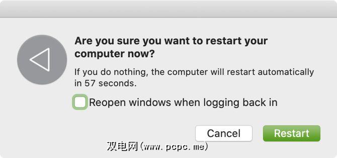 出现对话框询问您是否要重新登录后重新打开窗口,请取消选中该选项。您不想在启动时重新打开无响应的应用程序。