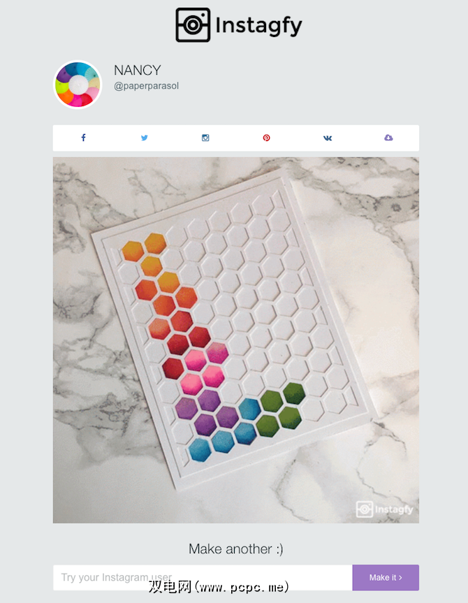 如果要用最受欢迎的Instagram照片制作gif,请使用Instagfy。只要输入您的Instagram用户名,Instagfy就会生成您可以在Instagram上共享的GIF。您可以将gif保存到计算机上,使用该站点的便捷嵌入代码将其嵌入到您的网站中,然后将其共享给Facebook,Twitter,Instagram或Pinterest。