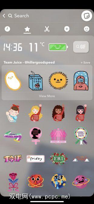 它将自动向您显示一系列GIF,并在菜单顶部显示及时的图形。但是只要滑动一下,您就会看到其他功能,包括表情符号,Bitmoji和裁剪工具。后者使您可以从“相机胶卷"中切出一部分照片并将其插入快照。