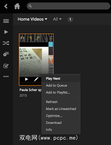 在浏览器中启动Plex,然后转到视频所在的文件夹或使用搜索功能找到它。如果将鼠标悬停在该文件的海报图像上,则会看到三个点以访问菜单。单击该按钮并选择优化。