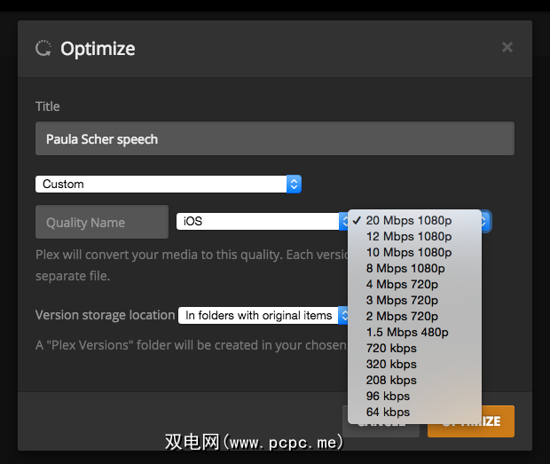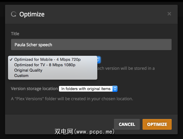 这将打开一个对话框,其中包含一些用于优化文件的不同选项。您可以进行优化,以便在智能手机,电视上观看,保持原始质量或选择自定义设置。