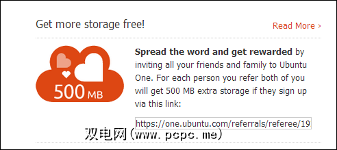 推荐朋友:您可以为每个推荐的人额外获得500 MB的空间,最多可以增加20GB。您可以免费获得总共25GB的存储空间。在Ubuntu One网站上登录您的帐户以获取引荐链接。![]()