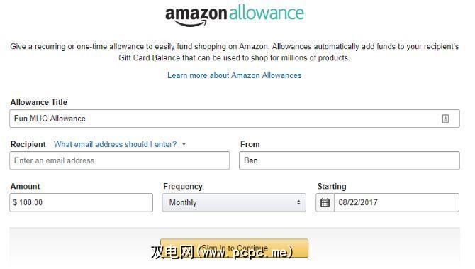 选择开始日期,然后单击登录以继续。登录到亚马逊,然后选择您要为这项津贴提供资金的付款方式。确保它将有可用于定期付款的资金。完成后,只需点击创建津贴按钮,您便已准备就绪。