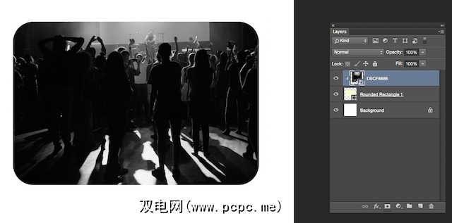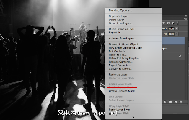 在“图层"面板中(可从 Windows访问 >> Layers ),您现在应该在矩形上方看到您的照片。右键单击照片图层,然后选择创建剪贴蒙版。这会将您的照片限制在