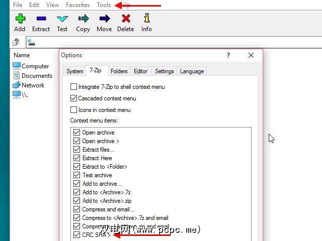 如果您没有使用CRC SHA功能,或者只喜欢使用另一个专用工具来计算CRC SHA值,就可以摆脱此上下文菜单项。为此,请先打开7-Zip文件管理器,然后转到工具>选项。。在7-Zip标签下,取消选中 CRC SHA 旁边的框,然后单击应用按钮。