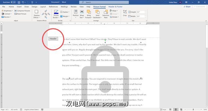 2。 仅在一页中在Word中插入水印。 Word会自动在文档的所有页面上放置水印。如果过大,只需在文档的第一页上应用水印即可。