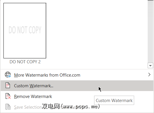 按照与上述相同的步骤,但是在下拉菜单下选择“自定义水印"。