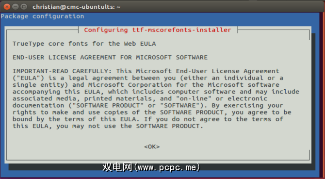 sudo apt-get install ttf-mscorefonts-installer通常,系统会提示您同意Microsoft EULA(以下是了解EULA的方法-已免费提供,您会注意到它们不是开源的。此外,EULA粘贴了“ Microsoft"