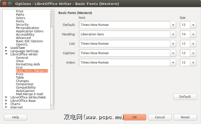 如果对字体满意,您甚至可以将自己喜欢的字体设置为LibreOffice writer中的默认选项。在文字处理器运行的情况下,打开工具>选项> LibreOffice Writer>基本字体(西方),然后选择您喜欢的字体。点击确定进行确认;