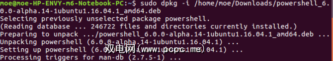 sudo apt-get install libunwind8 libicu55sudo dpkg -i /home/moe/Downloads/powershell_6.0.0-alpha.14-1ubuntu1.16.04.1_amd64.deb这将安装Windows PowerShell及其依赖项。由于我们是在具有超级用户权限的情况下进行安装,因此在安装过程中将提示您输入密码。