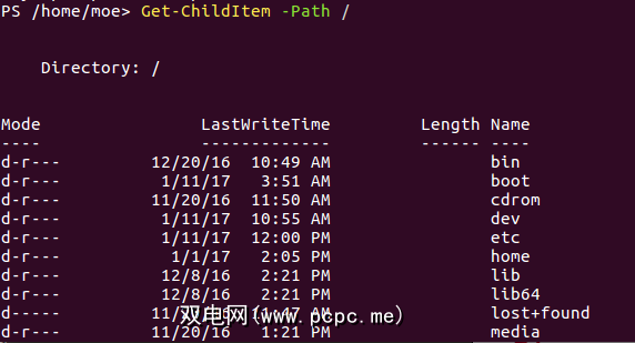 PS /home/moe>在这里,您可以使用Windows PowerShell与在Windows上完全一样。只需像正常情况一样运行PowerShell cmdlet。例如,我们可以运行: