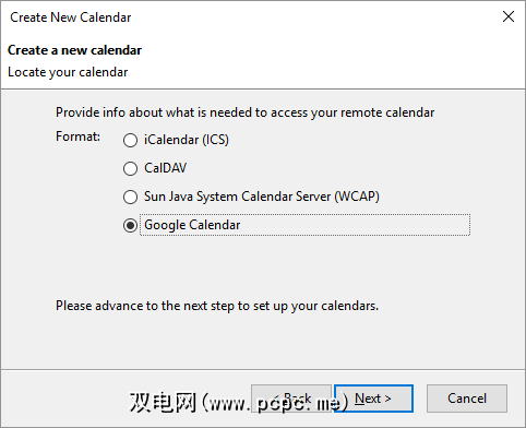 注意: Google日历选项仅在安装 Google日历提供程序后可用。您仍然可以使用iCalendar(ICS)格式添加公共Google日历,该格式提供只读访问权限(请参见下文)。
