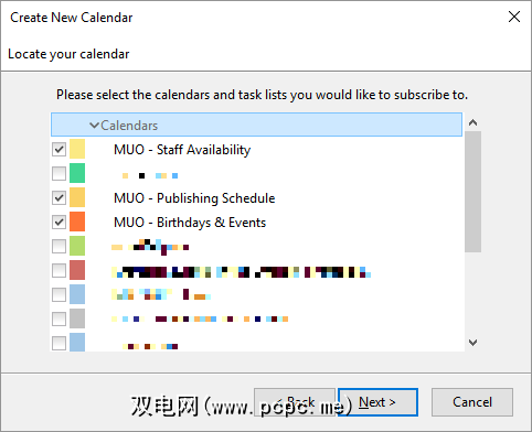 检查要添加的日历,单击下一步,等待确认您的日历已创建,然后单击完成。