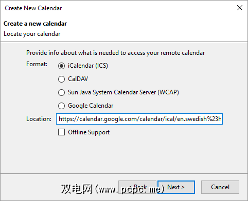 当您返回Thunderbird时,选择在网络上> iCalendar (ICS),输入位置,即ICS链接,然后单击下一步。