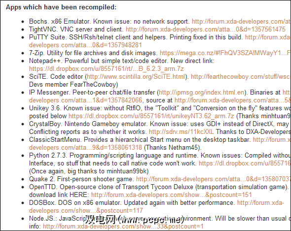 越狱后,您可以立即运行针对Windows RT的ARM体系结构进行了专门调整和编译的应用程序。由于许多流行的工具都是开源的,这意味着您可以运行一些流行的桌面程序,包括BitTorrent客户端,文本编辑器,VNC程序,旧游戏和其他工具。请查阅XDA开发人员论坛上移植到Windows RT线程的桌面应用程序,以获取可以运行的桌面程序的维护列表。除了可以运行旧版SNES和DOS游戏的游戏引擎和仿真器之外,您还会找到7-Zip,Notepad ++,PuTTY,TightVNC,Keepass,Miranda IM和Audacity等常用工具。