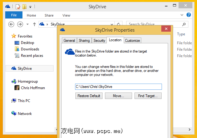 在桌面上使用SkyDrive应该很简单。如果要将SkyDrive文件夹移动到另一个驱动器(例如,从小型固态驱动器移动到较大的机械硬盘驱动器),只需在“文件资源管理器"中右键单击SkyDrive文件夹,选择“属性",然后使用“位置"上的选项