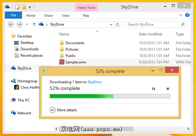 SkyDrive尝试智能地同步文件。假设您的SkyDrive帐户中已经有5GB的文件,并且您有一台新的Windows 8.1 PC。登录新PC后,SkyDrive不会自动下载所有文件。您将能够浏览SkyDrive文件夹中的所有文件,但是当您尝试打开它们时,SkyDrive会下载它们。微软将这些称为“智能文件",SkyDrive下载有关文件的信息,而不下载文件本身的内容。