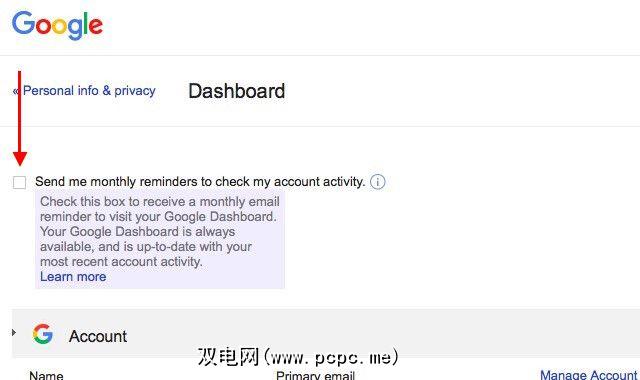 选中“控制台"页面顶部每月发送一次提醒我以检查我的帐户活动旁边的框,您都准备好了。 Google现在会每月提醒您访问仪表板并检查您的帐户活动中是否存在异常。