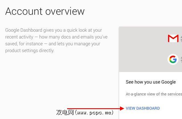 下一步,单击个人信息和隐私列中的帐户概述。这将加载一个新页面,其中突出显示了“帐户概述"部分。单击此处的查看仪表板链接,然后在出现提示时输入您的Google密码,以访问您的Google仪表板。