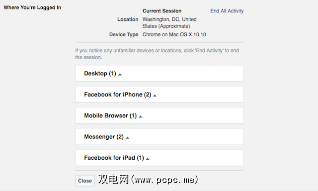 Facebook通过单击 End all activity (结束所有活动),可以轻松注销所有活动会话。可以通过单击与要注销的实例相关联的结束活动链接来有选择地结束会话。