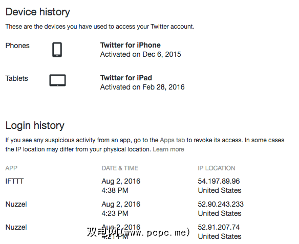 在此处,您会看到一个列表,其中列出了您的Twitter帐户上激活的所有设备以及您所使用的所有第三方应用程序已授予访问您帐户的权限。如果要查看是否有人登录到您的帐户,请查找Twitter.com的实例。