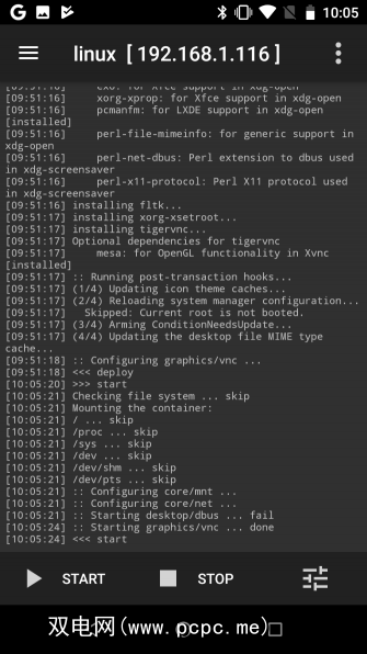完成后,请从Play商店安装VNC Viewer。在Linux Deploy中,点击开始以运行Linux。然后打开VNC Viewer,并连接到 localhost:5900 以使用您先前输入的凭据查看Linux桌面。