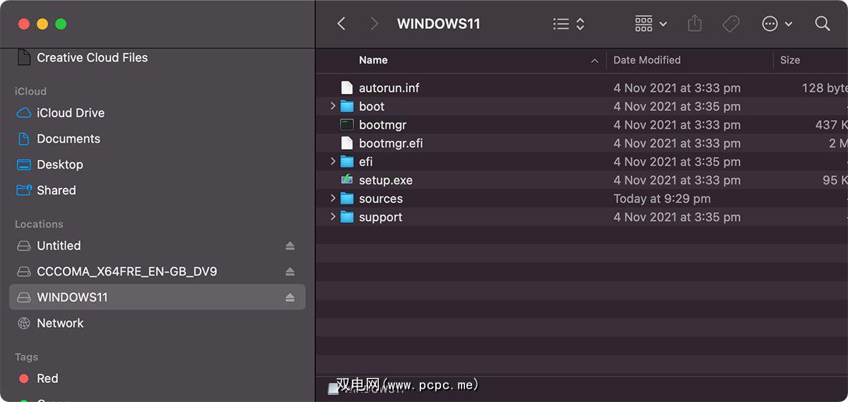 从 Mac 上的下载文件夹安装 Windows 11 ISO。您可以通过双击 ISO 文件来执行此操作,然后该文件应在 Mac 连接的设备中显示为CCCOMA_X64FRE_EN-US_DV9或类似名称。请记住将文件名与上面的完全匹配。如果它不同(由于不同的语言首选项),请确保在下面的命令中相应地更改它。