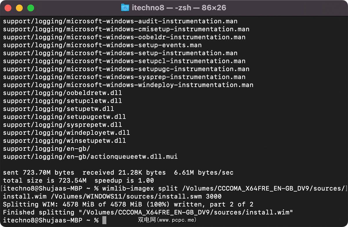 由于安装程序文件大于 4GB,我们将使用两个单独的命令来创建可启动磁盘。第一个命令将复制除 install.wim 文件(4.2GB)之外的所有文件。第二个命令将使用 wimlib 拆分 install.wim 文件并将其复制到 U 盘。