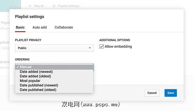 在排序下,您会看到有关YouTube播放列表中视频顺序的顶级控件有组织。现在我们的设置为手动,但是如果您对该设置不满意,可以按添加日期,最受欢迎或发布日期进行订购。