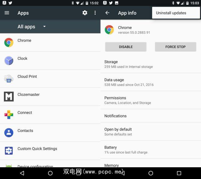 在应用程序菜单中,Android允许您将预安装的应用程序恢复为原始形式。对于像Chrome这样多年来变得越来越庞大的应用而言,这可能意味着相差100 MB或更多。要还原应用,请转到设置>应用,然后选择有问题的应用。在其信息页面上,点击右上角的三点菜单,然后选择卸载更新。这将删除所有更新,并将应用程序恢复为原始状态,希望在此过程中缩小其尺寸。