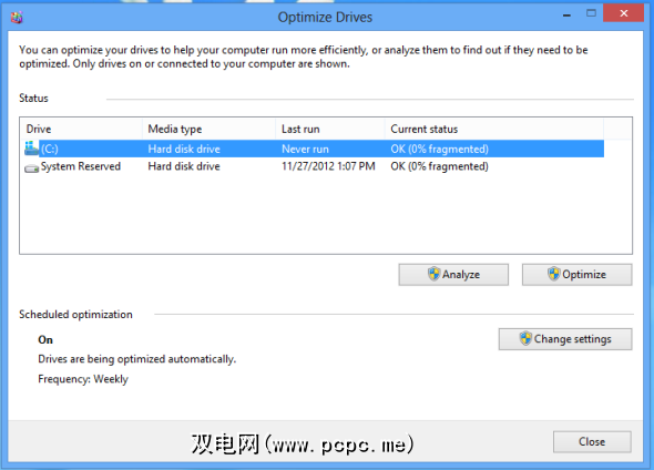 Windows 8包括标准的磁盘碎片整理程序,现在称为< em>优化驱动器工具。要访问它,请按Windows键,键入碎片整理,单击设置,然后按 Enter 。请注意,默认情况下,Windows 8每周自动对驱动器进行一次优化(碎片整理)。但是,如果您移动了很多文件,则可能希望更快地优化驱动器。